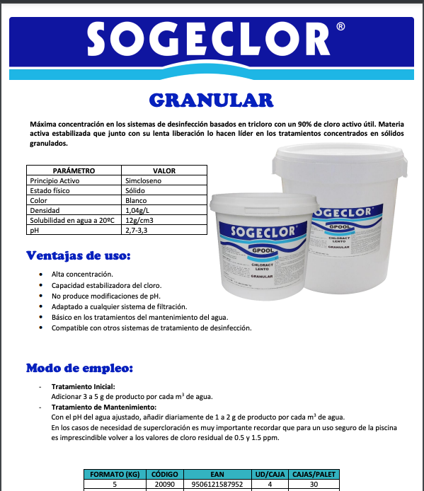 3-Tratamiento continuo: 5 gr por m3 de agua de 3-5 días (como complemento del cloro lento en tableta).