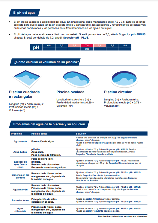 2-Tratamiento de choque: 10 gr por m3 de agua y dejar funcionar la filtración 24h.